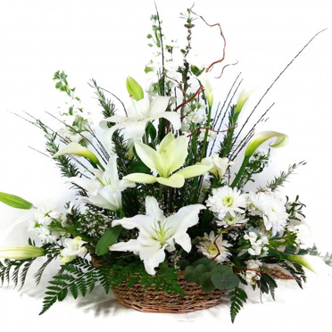 Fresh white oriental lilies and carnations are mixed with rich greens such as salal and ore..